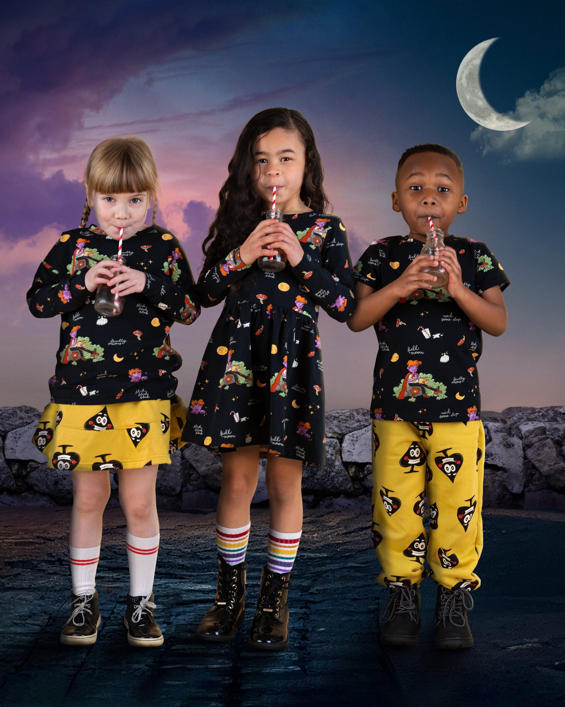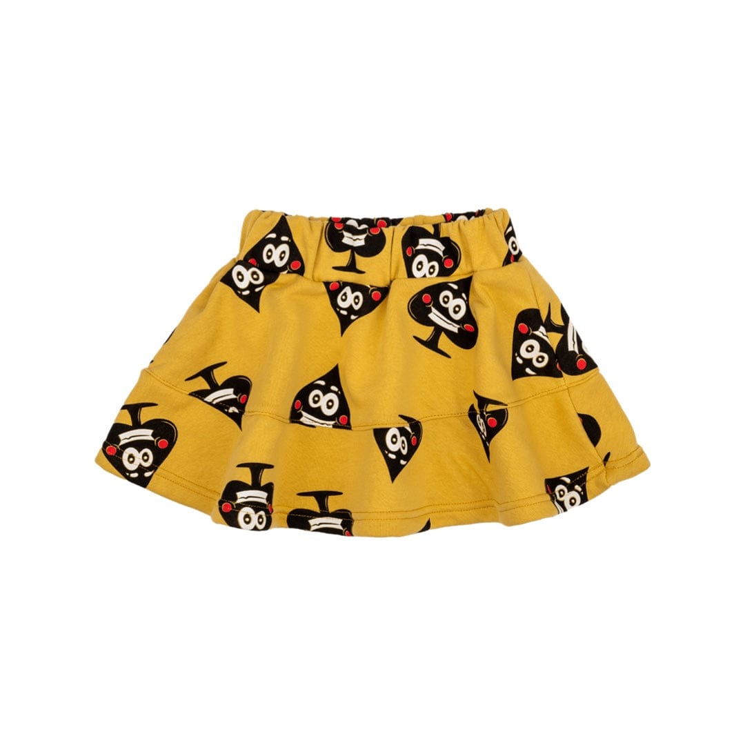 Raspberry Republic skirt in sweat material. Made in fun ace of spades print on bright yellow fabric. Match with many of Raspberry Republic's tops this AW23 season.