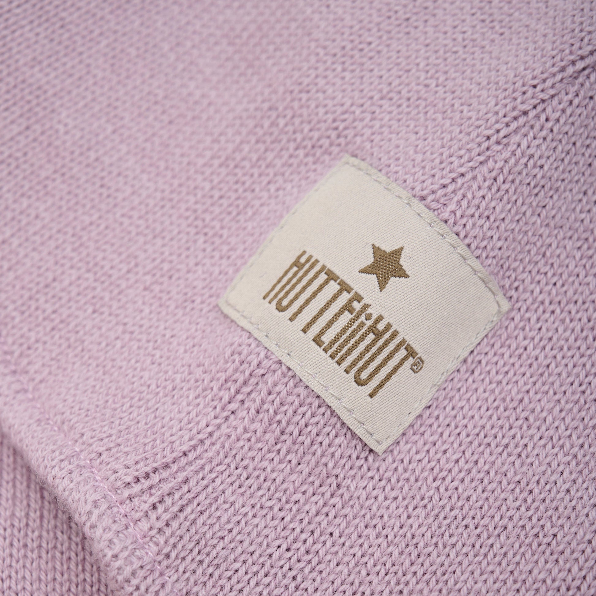 Soft HUTTEliHUT balaclava hat in two layers, in a solid colour,Nirvana. The HUTTEliHUT balaclava has a pixie shape and a round face opening. The hat features an extra layer over the ears for wind protection and has a practical split design at the bottom with extra length at the back. The balaclava is knitted in Merino wool, with a soft knitted cotton lining.