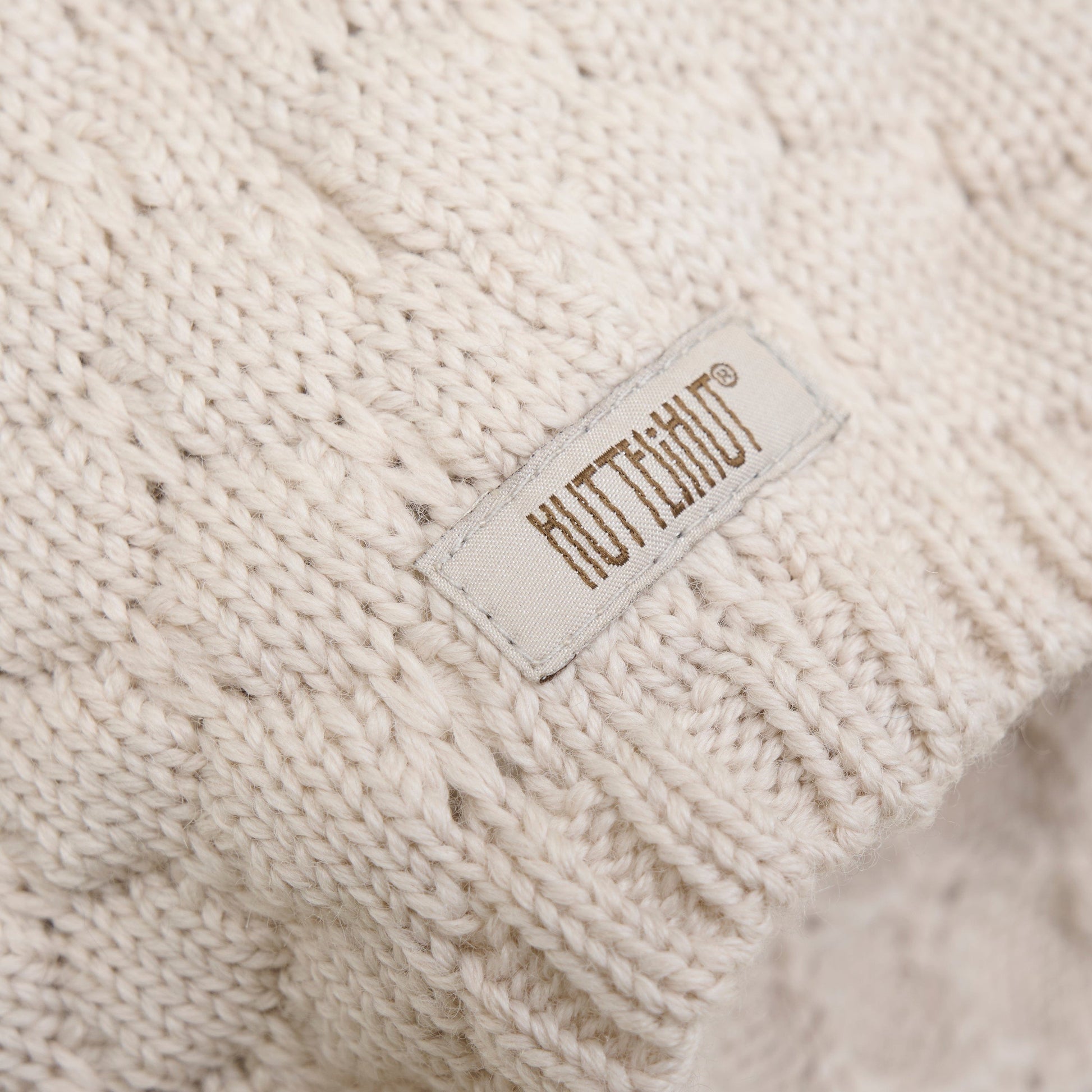 Lovely HUTTEliHUT knitted bonnet. The hat has a round head shape, giving it a nice classic look with sweet details. The HUTTEliHUT bonnet features ties to fasten around the chin, ensuring a good fit.