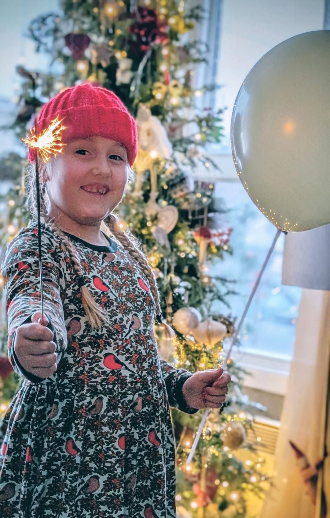 Long sleeve dress with gathered skirt in all over bullfinch print.