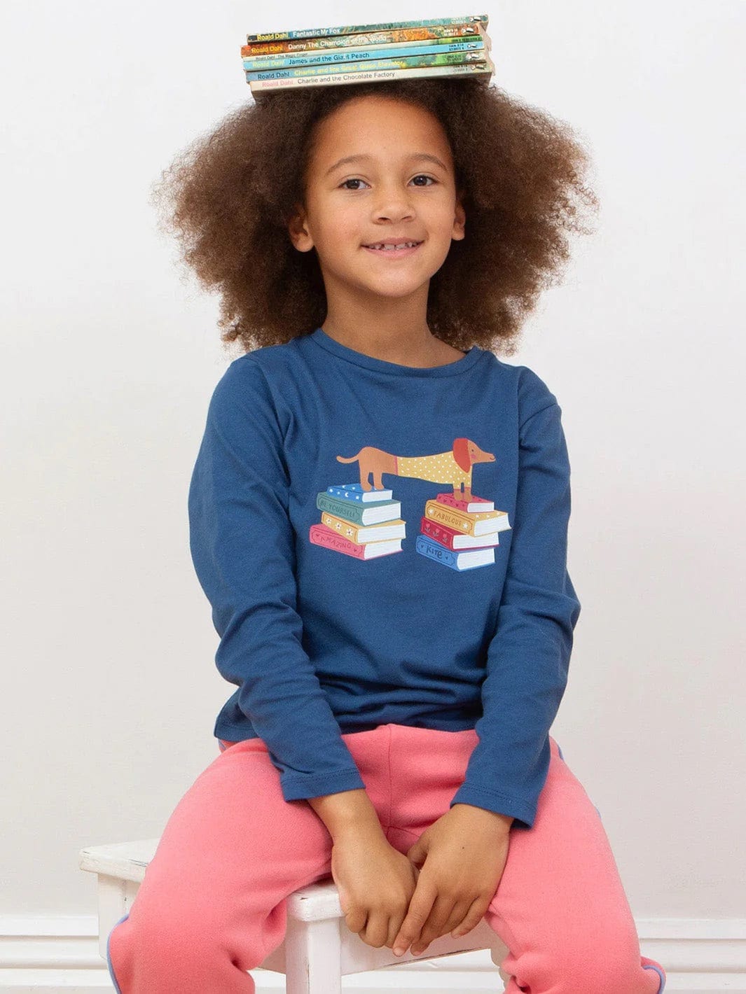 A tee for all the little clever sausages out there! This navy blue t-shirt depicts one of our founder Jo's dachshunds standing on a stack of books! With long sleeves and a classic round neck, it’s a brilliant everyday layer for all budding bookworms.