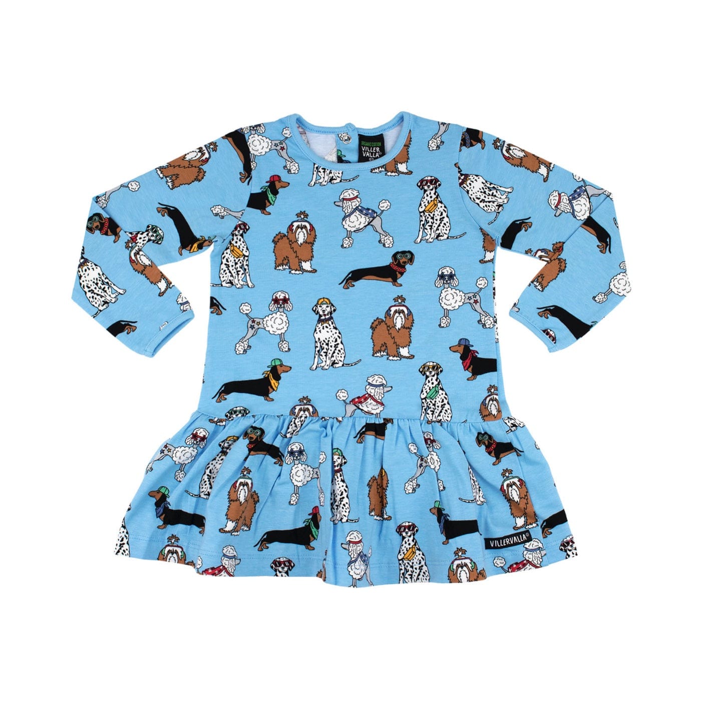 Dress in soft and comfortable jersey with dropped skirt. Funky dogs print on bay blue fabric.