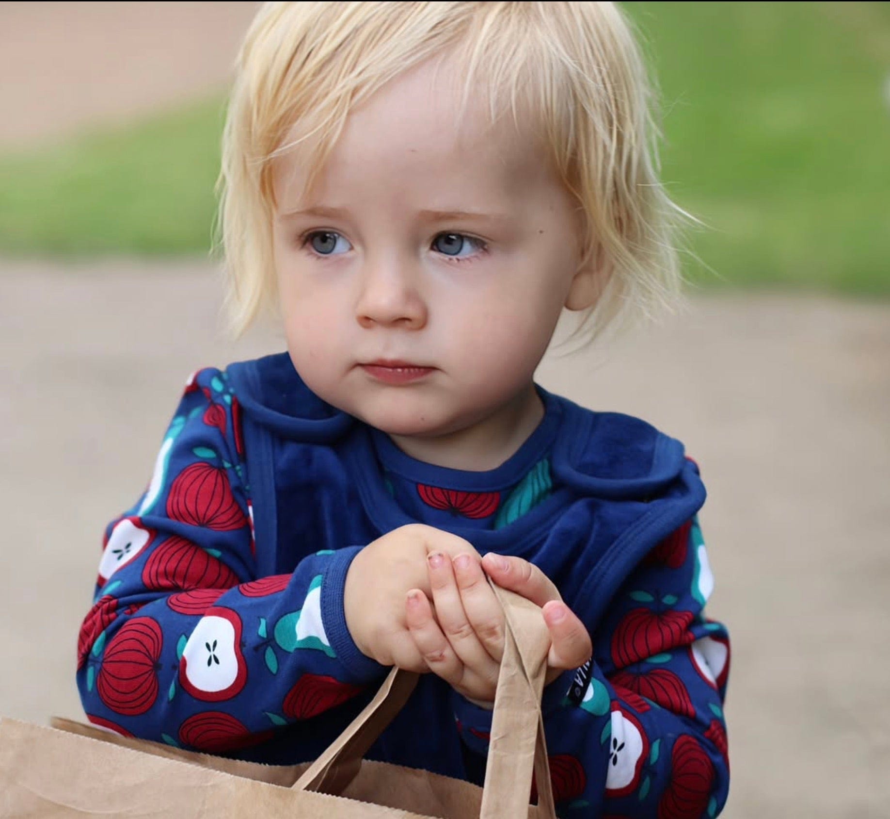 Villervalla bodysuit in garden fruit print on pacific blue fabric. Long sleeve with button at neck and crotch for easy dressing. Taping for comfortable wear. Villervalla brings you the best long lasting baby wear.