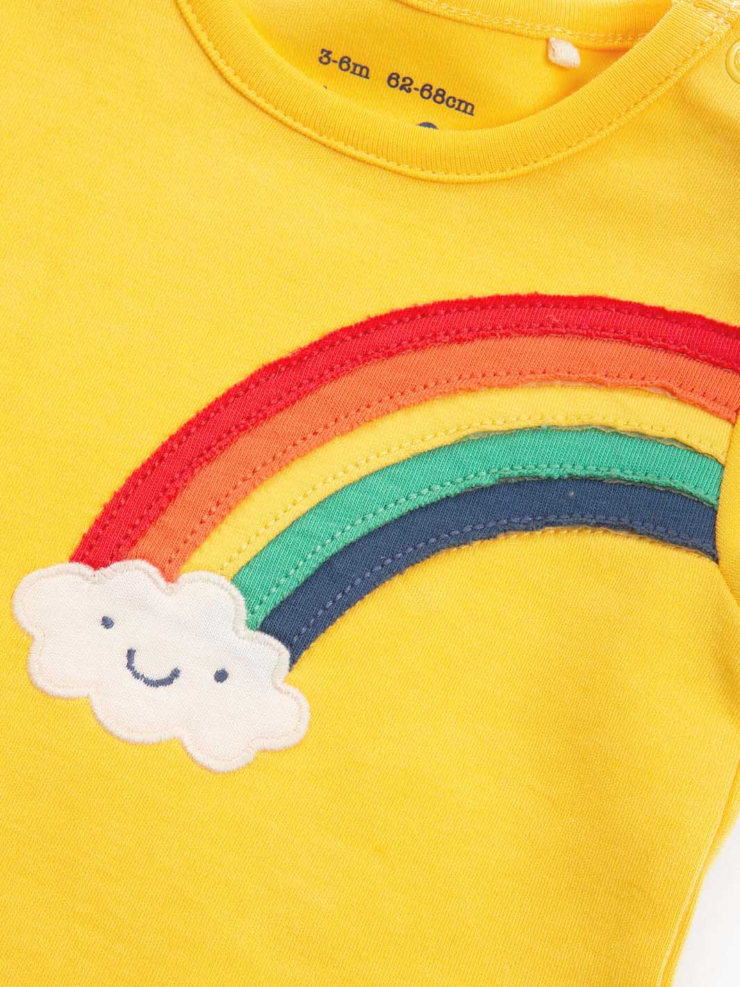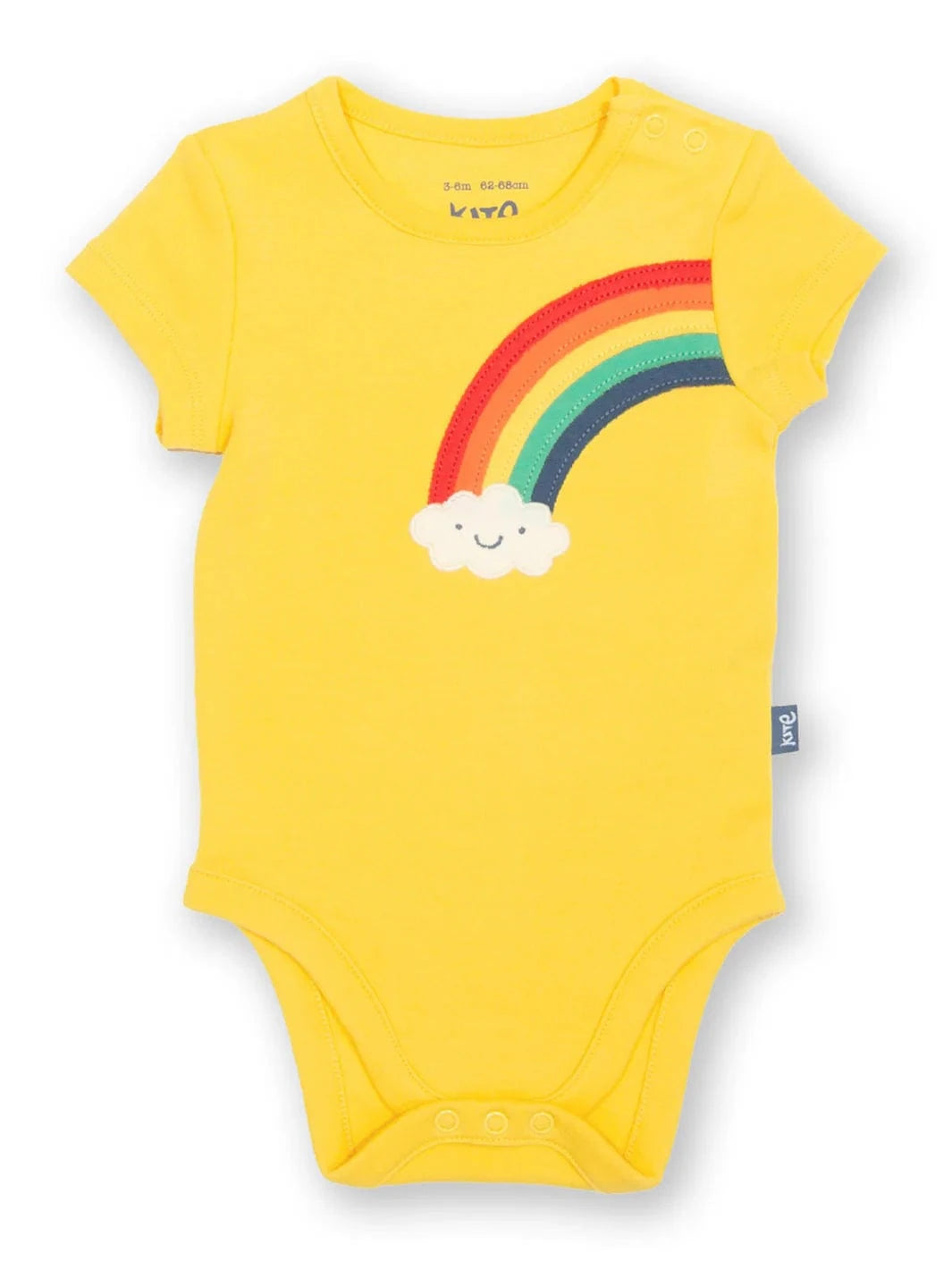 Kite's beautiful bodysuits are wonderfully soft and comfy, making them perfect for everyday. This short-sleeved baby vest with a smiley rainbow applique design looks great worn as a t-shirt or with our coordinating knit leggings. Ideal for naptimes too, and the handy shoulder popper opening makes change time easy peasy.