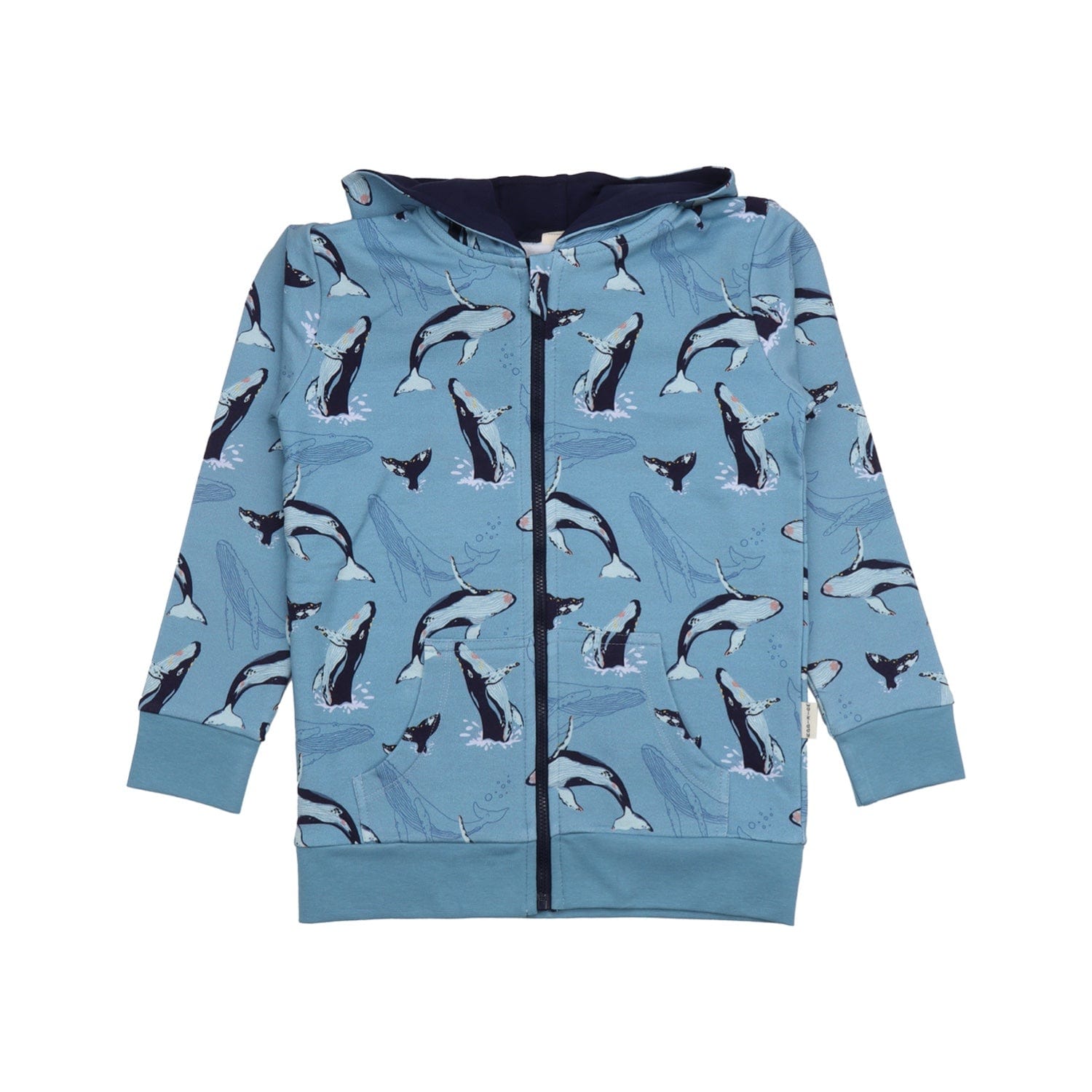 Walkiddy children's hoodie in jumping whales print on light blue organic cotton fabric. Cuffs on end of sleeves and zipper cover under neck. This classic hoodie is made of environmentally conscious organic cotton, perfect for keeping your little ones warm in any season.