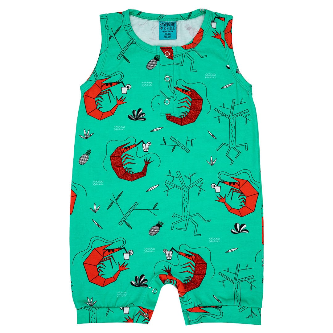 Raspberry Republic short romper in Shrimp Cocktail print. Great for warmer days. Small cuffs on legs and popper buttons on front and crotch for easy dressing.
