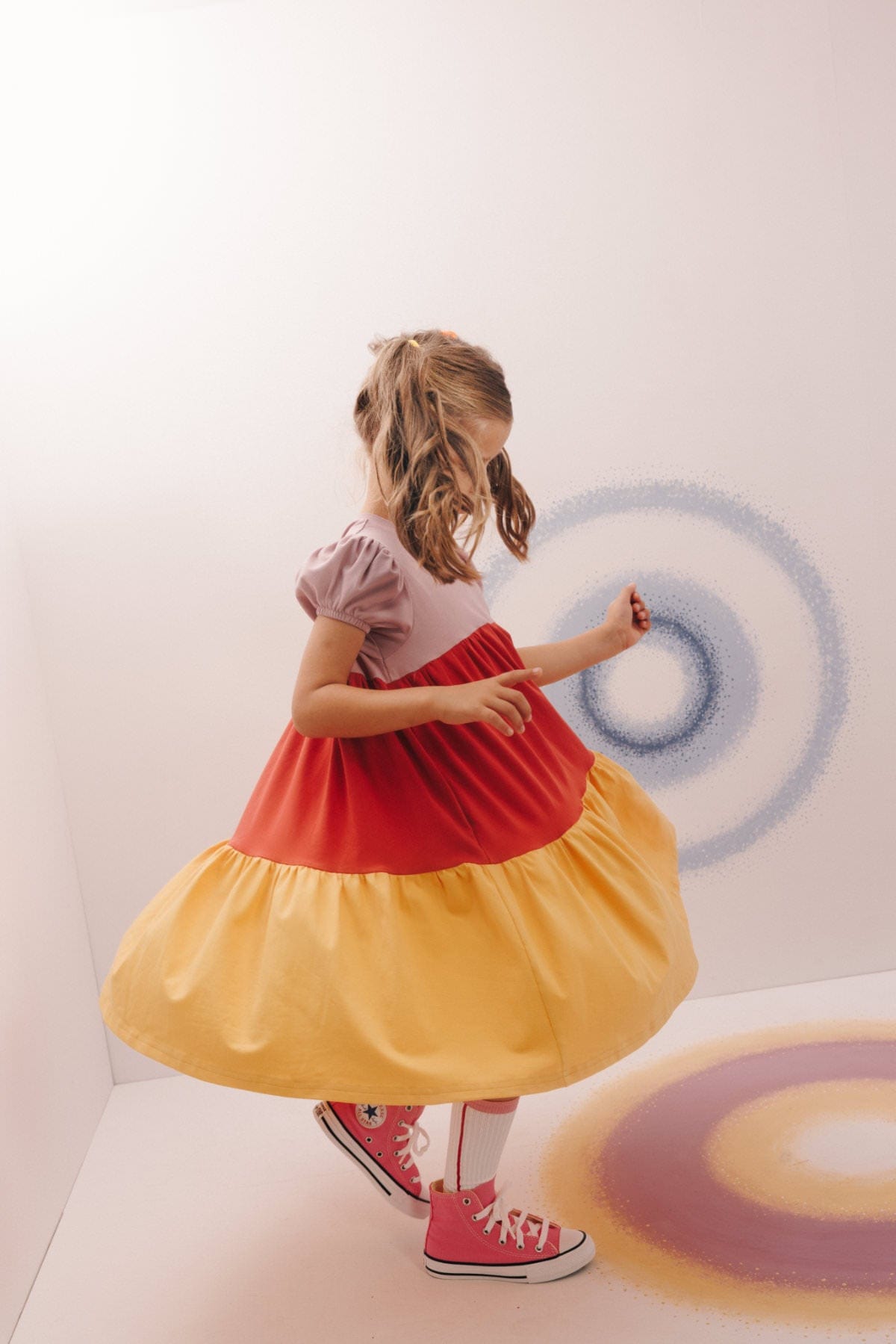 The Three Colours Puff Dress features a voluminous skirt that is perfect for twirling. With its wide range of colours, it's a lovely addition to any wardrobe, adding a touch of fun and versatility.